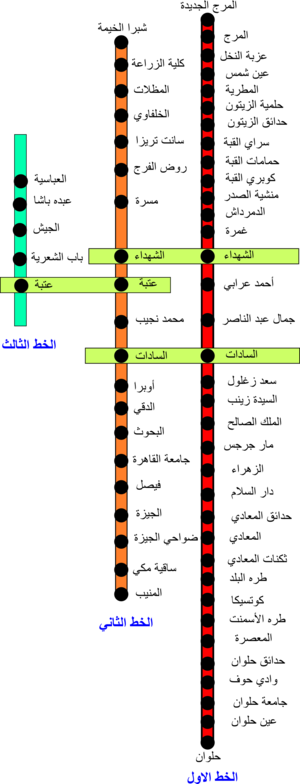 - ^ أ ب ت ث ج ح خ د ذ ر ز س ش ص ض ط ظ ع غ ف ق ك ل م ن هـ و ي أأ أب أت أث أج أح أخ أد أذ أر أز أس أش أص أض أط أظ أع أغ أف أق أك أل أم أن أهـ أو أي بأ بب بت بث بج بح بخ بد بذ بر بز بس "خطوط المترو". cairometro.gov.eg/. مترو القاهرة. Retrieved 2016-12-24.