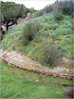 The Etruscans were highly religious cultural group that held a strong fascination with the afterlife.[5] Consequently, the Etruscans held an intense commitment to funerary traditions. Indeed, Etruscan tombs are so well decorated because of this intense fascination and they believed a notable offering would appease the dead and dissuade them from haunting the living. Burial sites were often located further away from the cities, which explains The Tomb of the Roaring Lions distance from the city of Veii. Like many Etruscan tombs the tomb was constructed from tufa, though often they were carved from natural bedrock. The tomb was also invisible from the surface, as is common amongst Etruscan tombs, however some tombs were marked by a tumulus.