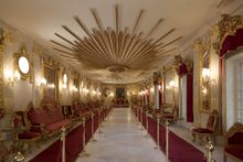 - سراي العرش: تتكون السراي من طابقين، السفلي ويطلق عليه قاعة العرش وهو عبارة عن قاعة كبيرة بها طاقم خشبي مذهب من الكنب والكراسي المكسو بالقطيفة، وبها صور كبيرة لبعض حكام مصر من أسرة محمد علي، بجانب صور لمناظر طبيعية من القاهرة والجيزة، وكان الأمير يستقبل ضيوفه في هذه القاعة في المناسبات مثل الأعياد. أما الدور العلوي فمكون من قاعتان للجلسات الشتوية، وحجرة نادرة مخصصة لمقتنيات إلهامي باشا وهو جد الأمير محمد علي لأمه، ويطلق عليها حجرة الأوبيسون لأن جميع جدرانها مغطاه بنسيج الأوبيسون الفرنسي.