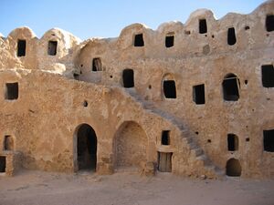 تقع في ليبيا على طريق طرابلس - العزيزية - الجوف في ليبيا على بعد حوالي 130 كيلومترًا من طرابلس. تم بناؤه ليكون بمثابة مخزن الحبوب للعائلات من المنطقة المحيطة مقابل ربع محاصيلهم، والتي يقال أن المالك قد وهبها وقف لتدريس القرآن والمواد الإسلامية ذات الصلة لأهالي المنطقة.