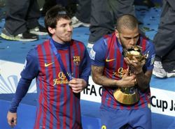 دانيال ألڤس وليونيل مسي أثناء تسلم جائزة كأس العالم للأندية 2011.