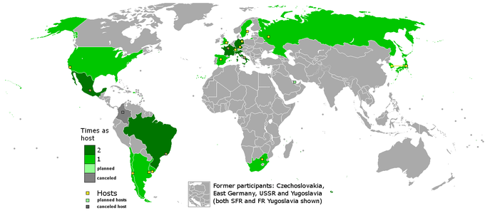 - ^ FIFA considers that the national team of Russia succeeds the Soviet Union, the national team of Serbia succeeds the Yugoslavia/Serbia and Montenegro, and the national team of Czech Republic succeeds the Czechoslovakia. ("Russia". FIFA.com. Fédération Internationale de Football Association.; "Serbia". FIFA.com. Fédération Internationale de Football Association.; "Czech Republic". FIFA.com. Fédération Internationale de Football Association. Retrieved 12 مايو 2014.).