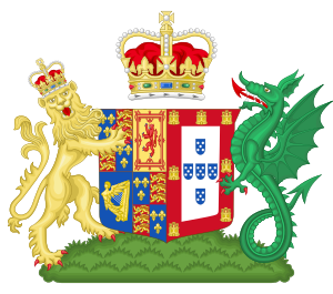 The royal arms of the British monarch are impaled with the royal arms of her father. For supporters she used the crowned lion of England on the dexter side, and on the sinister the wyvern Vert of Portugal.[1]