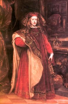 كارلوس الثاني من إسپانيا يرتدي رداء فرسان الوبر الذهبي، حوالي عام 1673، رسم خوان كارينو ده ميراندا.