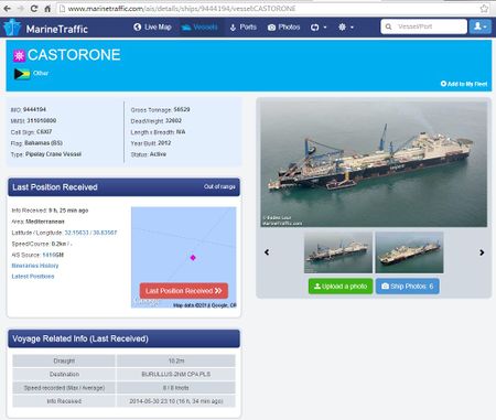 صباح 14 يونيو 2014: كاستورونه تنتقل بسرعة 9.4 عقدة لتعمل على بعد 10 كم شمال بورسعيد. |