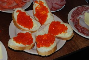 ▪ الكافيار الأحمر :- اما الكافيار الاحمر فيُنتَج من بيض سمك السلمون السيبيري وسمك النقط وغيرهما من الاسماك التي تعيش في انهار الشرق الاقصى الروسي. ويتنوع لون الكافيار الذي يأخذ شكل حبيبات دقيقة بين الأسود والرمادي والأصفر والبني. غير أن بعض أنواعه قد يصل حجمها إلى حجم حبات البازلاء.[7]