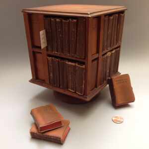 - Queen Mary's Dolls' House at Windsor Castle in Great Britain contains a miniature library of 200 books[30] created expressly for the collection in the 1920s at a 1:12 scale. Along with reference volumes, a Bible and the Quran, the library includes works—some written expressly for the collection—by prominent authors of the day such as Arthur Conan Doyle, Thomas Hardy, and Vita Sackville-West.[31] The books were bound by Sangorski & Sutcliffe, and contained miniature bookplates illustrated by E. H. Shepard.[32]