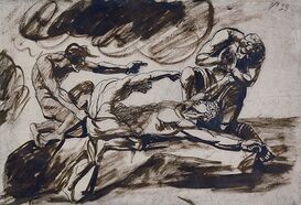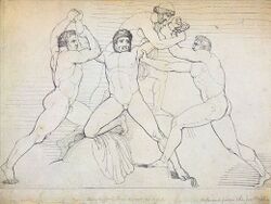 Richard Porson's 1795 translation of Prometheus Bound was illustrated with drawings by John Flaxman showing the famous binding scene.[23] Between 1798 and 1799, George Romney produced a series of chalk drawings of scenes from Prometheus Bound, including the binding scene with Kratos and Bia.[23] In both Flaxman and Romney's illustrations, Kratos and Bia are shown together in symmetry.[23] In 1819, Percy Bysshe Shelley adapted the myth of Prometheus for his own play Prometheus Unbound.[23]