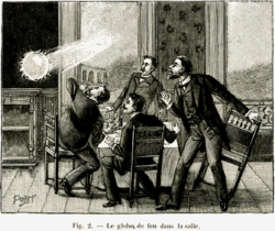 يمكن ان تظهر كرة البرق بعد حدوث هذا الأخير. هي غالبا ذات لون اصفر يذهب إلى الحمرة ويمكن ان تكون أيضا بلون ازرق، اخضر أو أبيض. وهي مصحوبة عادتا بصوت قريع أو صفير بعد الرعد و برائحة الأوزون ، الكبريت أو أكسيد نيتروس. قطرها ما بين 20 و 40 سم ومدة بقائها بين 1 إلى 30 ثانية مع حركة دورانية حول نفسها. تبدي كراة البرق عادتا حساسة يالنسبة لمجال كهرومغناطيسي ، ينجدب نحو الخيوط و المأخد الكهربائية، أو السيارات. كرة نار يمكن ان تشتعل بطريقتين: