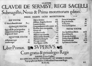- كلودان دو سيرميزي، *"تحرير جديد وأول للموتيتات الخاصة بمساعد رئيس كنيسة القصر..."* - باريس، بي. أتانيان، ۱۵۴۲ (راجع هارتز 1969، رقْم ۱۰۳).