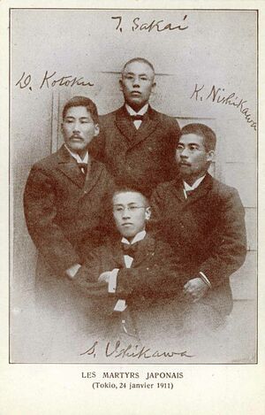 Kōtoku Denjirō (幸徳 傳次郎, November 5, 1871 – January 24, 1911), better known by the pen name Kōtoku Shūsui (يابانية: 幸徳 秋水, [koːtokɯ ɕɯːsɯi]), was a Japanese socialist and anarchist who played a leading role in introducing anarchism to Japan in the early 20th century. Historian John Crump described him as "the most famous socialist in Japan".[1]