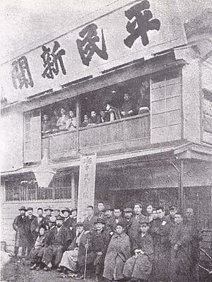 In 1903, Yorozu Chōhō came out in support of war with Russia, as its editor decided to support the upcoming Russo-Japanese War.[9] In protest against this decision, in October 1903 Kōtoku was one of a number of journalists who resigned to found the Heimin-sha group,[11] alongside its associated anti-war Heimin Shinbun newspaper, which started publication in November.[9][12]