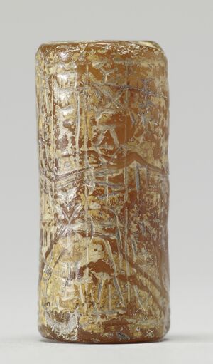 Seals were used widely across the Near Eastern kingdoms during the Kassite rule. They were used to mark official items and ownership.[47] The images created by these seals were unique to each seal, but many shared the same subject matter. Bearded men, religious symbols, horned quadrupeds, and fauna are often shown in these images.[48] The seals were generally made of stone, glass, or clay. The images were made by stamping or rolling the seals into wet clay.[49]
