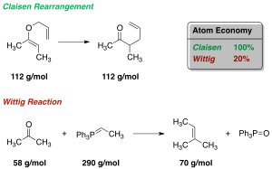 For example, the Claisen rearrangement and the Diels-Alder cycloaddition are examples of reactions that are 100 percent atom economical. On the other hand, a prototypical Wittig reaction has an especially poor atom economy (merely 20 percent in the example shown).
