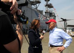 McFarland interviews World War II veteran Lou DiPaolo on the deck of the USS Iwo Jima in New York in 2011