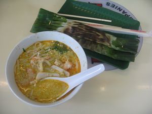 Curry Laksa is a coconut-based curry soup.[1] The main ingredients for most versions of curry laksa include bean curd puffs, fish sticks, shrimp, and cockles. Some vendors may sell chicken laksa. Laksa is commonly served with a spoonful of sambal chilli paste and garnished with Vietnamese coriander, or laksa leaf, which is known in Malay as daun kesum.