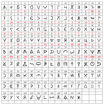 | Volga Bulgar – البلغَاڔِى | Chuvash – Чӑвашла[42] | Proto-Turkic | Volga Bulgar – البلغَاڔِى | Chuvash – Чӑвашла | Proto-Turkic | ||