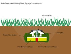 تتكون الألغام الأرضية بشكل عام من هيكل بلاستيكي أو من مادة غير قابلة للصدأ، أعلاه مساحة عريضة أسفلها طارق مرتبط ب«ياي» ينطلق عندما يطأه الفرد ليفجر شحنة التفجير المبدئية في المنتصف ( المنطقة الحمراء في الرسمم البياني) التي تفجر الشحنة الناسفة الأساسية(على الأجناب). وبهذه الطريقة يشبه طريقة تفجير الرصاصة العادية.