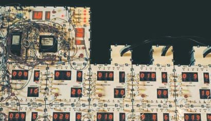 حاسوب يقاوم التحطيم: تمثل هذه الصورة منظومة ثنائية البعد لخلايا صنعية، تتألف كل واحدة منها من معالج بسيط. وفي هذا النوع من التطبيق تعمل أربع خلايا معا كساعة إيقاف stopwatch، وهناك خلية واحدة لكل رقم. تعد كل خلية إما حتى الرقم خمسة، أو حتى الرقم تسعة، ويتوقف ذلك على إحداثيات الخلية ضمن المنظومة. أما بقية الخلايا في المنظومة، فتعمل كقطع غيار احتياط تتولى المهمة مكان الخلية التي تخفق أو تقتَل. إن خلايا المنظومة المسماة بيوديول Biodule 601،التي تظهر في هذا الشكل، هي خلايا تأسست استنادا إلى بنية «الميكتري» الموصوفة في النص.