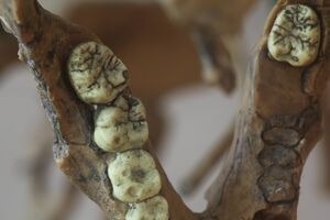 A study of the mandible across a number of specimens of A. afarensis indicated that Lucy's jaw was rather unlike other hominins, having a more gorilla-like appearance.[32] Rak et al. concluded that this morphology arose "independently in gorillas and hominins", and that A. afarensis is "too derived to occupy a position as a common ancestor of both the Homo and robust australopith clades".[33]