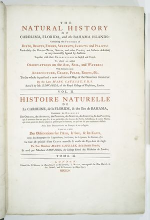 - مارك كاتسبي، التاريخ الطبيعي لكارولينا، وفلوريدا، والباهاماس نسخة إلكترونية: صور عالية الدقَّة وكلماتٍ مقروءة من برامج الدراسات الأمريكيَّة في جامعة ڤرجينيا.
