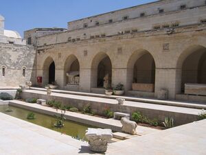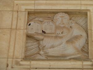 The museum was designed by Austen Harrison, chief architect of the Mandatory Department of Public Works, who drew up blueprints for a white limestone building integrating eastern and western architectural elements.[2] The cornerstone of the new museum was laid on June 19, 1930, but construction was delayed due to the discovery of tombs dating to the fifth century B.C. at the building site.[11] The museum features a stone bas-relief of the meeting of Asia and Africa above the main entrance together with ten stone reliefs illustrating different cultures and a gargoyle fountain in the inner courtyard carved in 1934 by the British sculptor Eric Gill (1882–1940).[12] Gill also produced stone carved signage throughout the museum in English, Hebrew, and Arabic; the Hebrew lettering was inspired by fonts from recently discovered Second Temple-era artifacts, most prominently the Uzziah tablet, but also ossuaries from the period.[13]