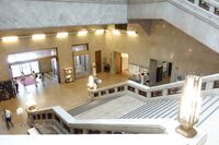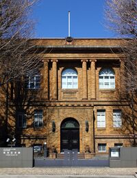 A ceremony attended by Emperor Meiji opened the museum and zoo on 20 March 1882; the library was reopened on September 30.[7] The facilities were open to the public every day except Mondays and two days around the New Year.[7] In 1888[7] or 1889,[5] the imperial household took over ownership of the museum, focusing its operations on cultural and scientific pursuits and ending its direct involvement with trade and industry.[7] The original Honkan was severely damaged in the Great Kanto earthquake of 1923,[5] and exhibits were moved to the undamaged Hyokeikan.[17] The structure having originally been promoted as having "solidity... matched by no other" in Japan, its collapse led to disillusionment with the architecture and style it represented.[18]