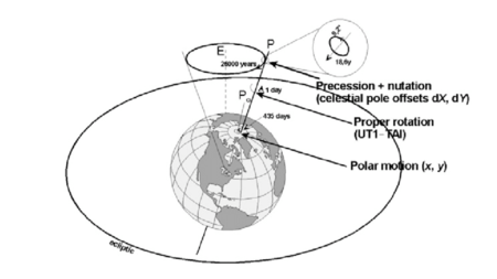 نظرًا لحركة القطب البطيئة جدًا للأرض ، لا يبقى القطب الفلكي السماوي (CEP ، أو القطب السماوي) ثابتًا على سطح الأرض. يتم حساب القطب الفلكي السماوي من بيانات المراقبة ، ويتم حسابه في المتوسط ، لذا فهو يختلف عن محور الدوران اللحظي بمصطلحات شبه يومية ، والتي تكون صغيرة بما يقل عن 0.01 (انظر [3]). عند إنشاء نظام إحداثيات ، يتم استخدام نقطة أرضية ثابتة تسمى القطب المرجعي للأنظمة الدولية لدوران الأرض والمراجع، أو خطة التسجيل الدولية ، كأصل ؛ المحور س في اتجاه خطة التسجيل الدولية ، خط الطول المرجعي دولي لأنظمة دوران الأرض والمراجع ؛ المحور ص في الاتجاه 90 درجة غربًا. x و y هي إحداثيات القطب الفلكي السماوي نسبة إلى خطة التسجيل الدولية..