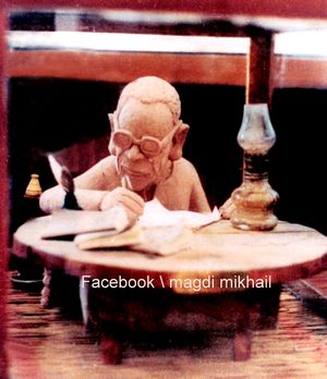 - تمثال للكاتب المصري نجيب محفوظ يصوره وهو جالس يكتب علي طبلية من اعمال النحات مجدي ميخائيل وهو من مقتنيات جريدة الاهرام