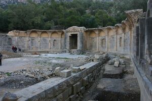 كان للجدار الخارجي نواة من الخرسانة الرومانية مغطاة بمسامير الحجر الجيري الخشن. يمتد هذا الجدار من نهايات الرواق على شكل هلال وينقسم إلى 26 قسماً بأعمدة متشابكة. في كل قسم ثان يوجد مكان مخصص للتماثيل التي لا تبقى واقفة. مقابل كل عمود ملتصق يوجد عمود كامل، والذي تدعم معاً الباحة المقببة. الأقبية مصنوعة من الحجر الجيري المسامي المغطى بالرخام، بينما الأعمدة من الحجر الرملي. أُغلق الجزء الخارجي من القبو باستخدام بلاطات مقطعة وتُرك دون مزيد من الحماية. أرضية الرواق مزينة بالفسيفساء. بُنيت الحجرة، كأهم جزء من المبنى، من الحجر الجيري وهي مكسوة بالرخام.