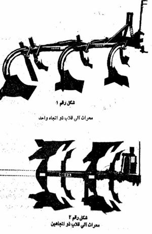 - 2-المحراث ذو الاتجاهين: وهو مجهز بهيكلين أحدهما فوق الآخر وكل هيكل يتجه إلى ناحية بحيث يقوم الهيكل الأول بقلب التربة إلى اليمين. وعند وصول الجرار إلى آخر خط الحراثة في الحقل يتم قلب الآلة ميكانيكياً ليحتل الهيكل الثاني مكان الهيكل الأول بحيث يمكن العودة في تلم ملاصق للأول وبنتيجة لهذه العملية تتم حراثة الحقل بشكل مشابه.