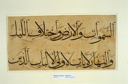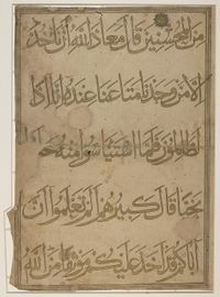 صورة صفحة من مصحف (الآيات 93-95 من سورة الأنعام) مكتوب بالخط المحقق، يعود إلى القرن الرابع عشر أو القرن الخامس عشر الميلاديين