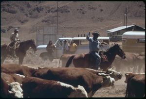 Spring roundup of Paiute-owned cattle begins at Pyramid Lake Indian Reservation, 1973.