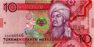 In 1959, the USSR issued a postage stamp to mark the 225th anniversary of the birth of Magtymguly.[47] In 1983, the USSR issued another stamp to mark the 250th anniversary of his birth.[48] Turkmenistan issued a 10 manat banknote bearing his likeness in 2009.