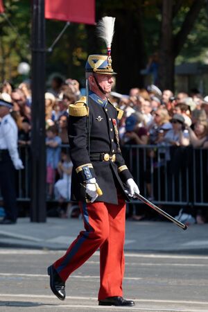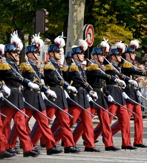 Cadets of Saint-Cyr wear in full dress (grand uniforme or GU) a special uniform, derived from the 1845 Regulations Infantry Officer Dress. This dress incorporates a dark-blue tunic, red trousers (red skirts for female cadets) and a shako with red and white plumes. Tunic facings and trouser stripes are light blue,[5] as is the képi worn on less formal occasions. Red fringed epaulettes are worn by cadets and yellow by cadet-officers. This traditional uniform was worn by both cadets and instructors at Saint-Cyr from 1845 until 1914 and then again from 1930 until 1939.[6] After World War II it was again adopted in 1949.[7]