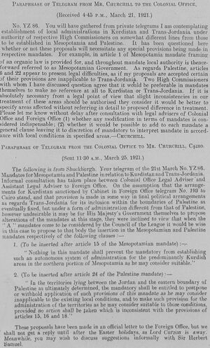 The memorandum described how the British government planned to implement Article 25 of the Mandate, which had been drafted during the March 1921 Cairo Conference to include Transjordan in the Mandate without applying the provisions regarding Jewish settlement.[2]