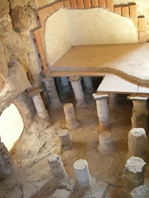 18–21. Western Palace: 18. منطقة خدمية. 19. منطقة سكنية. 20. storerooms. 21. منطقة ادارية. 22. tanners' tower. 23. البوابة البيزنطية الغربية. 24. columbarium towers. 25. كنيس. 26. كنيسة بيزنطية. 27. barracks.