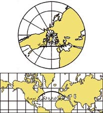 مسافة الدائرة الكبرى great-circle distance طريقُ الدَّائرة الكُبرى أقصر طريق بين نقطتين على سطح الأرض وأكثرها استقامة. والدَّائرة الكبرى أيُّ دائرة تقسم الكرة الأرضية إلى نصفين متساويين، طولها هو طول خط الاستواء. ويبدو على أغلب الخرائط المسطحة أن الخط المستقيم هو أقصر مسافة بين مكانين. ويظهر طريق الدائرة الكبرى غالبًا على شكل مُنْحَنى طويل. ولكن الخرائط ليست الصورة الحقيقية لسطح الأرض. فالخرائط مسطحة والأرض كرويَّة، لذا فإن أقصر مسافة بين نقطتين على الأرض يمكن أن تجدها بسهولة على الكرة الأرضية فقط. إن أقصر المسافات تقع على طول الدائرة الكبرى التي تمُّر على النقطتين. وهناك نوع خاص من الخرائط يسمى خريطة الإسقاط المماسي المركزي (المسقط المزولي) يشير إلى طريق الدائرة الكبرى كخط مستقيم.