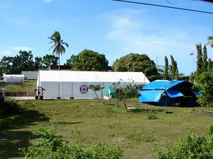 A field hospital is a medical staff with a mobile medical kit and, often, a wide tent-like shelter (at times an inflatable structure in modern usage) so that it can be readily set up near the source of casualties. In an urban environment, the field hospital is often established in an easily accessible and highly visible building (such as restaurants, schools, hotels and so on). In the case of an airborne structure, the mobile medical kit is often placed in a normalized container; the container itself is then used as shelter. A field hospital is generally larger than a temporary aid station but smaller than a permanent military hospital.
