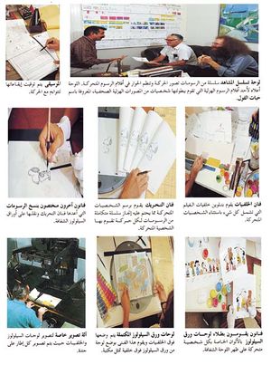 يقوم رسامو الخلفيات برسم المناظر التي تشكل كل العناصر اللازمة باستثناء الشخصيات. ويتولى رسامو التحريك تنفيذ اللوحات الخاصة بالشخصيات بأعداد محدودة وفق المتطلبات الحركية للحوار، بناء على شريط العرض. ففي حالة قيام إحدى الشخصيات بالرد على الهاتف مثلاً، بقوله: نعم، يتضح من الرجوع إلى شريط العرض أن هذه الكلمة تستغرق ثمانية إطارات من الشريط الفيلمي. وهكذا يصبح لزامًا على رسامي التحريك تنفيذ حركة الشفاه في تسلسل من ثماني لوحات تحاكي شكل الفم عند نطق الكلمة، إضافة إلى كل الحركات المصاحبة التي تأتي بها الشخصية التي يتم رسمها.