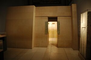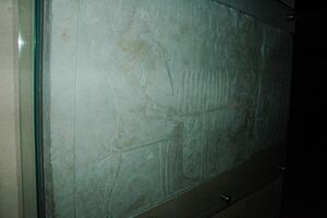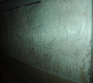 The northern false door of the west wall is an additional ritual location. It also features a short offering list, names and titles of Kaninisut and an offering scene. On the inner doorposts, there are further servants carrying Hes vases. Another servant in the lower part of the outer doorposts holds up a washstand. All the servants face towards the door niche. In the door niche, there is a large hole which was possibly cut by a grave robber hoping to find a serdab with a ka-statue in it. In the upper portion of the doorposts, the wife of Kaninisut is depicted, who does not look towards the door niche like the servants, but instead towards the large image of Kaninisut on the north wall.[11]