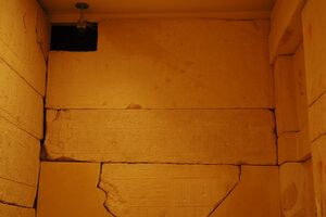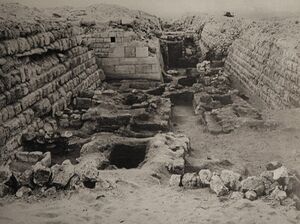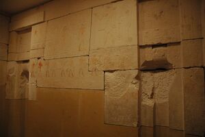 The substructure of Kaninisut's mastaba was a 17 m deep vertical shaft grave, which led, via a short corridor, to a grave chamber roughly hewn from the rock. The rough execution of the grave chamber stands in sharp contrast to the fine execution of the cult chamber. Apparently, the underground spaces' execution was increasingly neglected in the later fourth dynasty. No remains of the deceased could be found.[6]