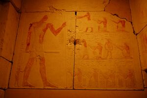 At the south door jamb, the delivery of an antelope is depicted on the south wall. Two men, wearing only kilts with three bands, bring the animal as an offering. The funerary priest Ankh-haf holds the antelope at the mouth and horns. The "leader of the hall" drives the animal forward with a stick. A man in front brings other offerings. The antelope is a donation from a property which provided materials for the funerary cult of Kaninisut. Above it are further images of offering gifts, arranged in two rows.[8]