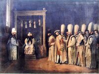 - Hibetullah Sultan (17 March 1759 - 7 June 1762) - with Mihrişah Kadin.[29] Also called Heybetullah Sultan or Heyyibetullah Sultan. Hers was the first imperial birth in 29 years, and was therefore celebrated for ten days and ten nights in an extremely luxurious way. Her nurse was Emine Hanim, sister of Aynülhayat Kadın, and, being Mustafa's mother, Mihrişah Kadin, died, was his sister, Saliha Sultan, wife of the Grand Vizier, who presided over her Cradle Procession. At three months, she was betrothed to Hamid Hamza Paşah. In the luxurious ceremony, her father gave her the lands of Gümrükçü, but she died of illness at the age of three before being able to celebrate the marriage. She was buried in the Mustafa III mausoleum.