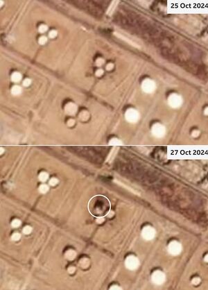 الأعلى: صورة ساتلية لمصفاة عبادان النفطية في 25 أكتوبر 2024. الأسفل: صورة ساتلية تظهر الأضرار الناجمة عن الضربات الإسرائيلية في 27 أكتوبر 2024.