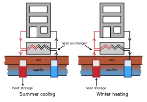 حسب الإرتفاع، درجات الحرارة تحت 60 أمتار من سظح الأرض تحافظ على ثباتها تقريباً بين 10 و16 °س (50 و60 °ف)،[3] إذا لم تتأثر درجات الحرارة بوجود مضخة حرارية. مثل المبردات أو تكييفات الهواء، هذه النظم تستخدم مضخة حرارية للإجبار على نقل حرارة الأرض. مضخات الحرارة يمكن أن تنقل الحرارة من الفراغ البارد إلى الفراغ الدافئ،، على عكس الاتجاه الطبيعي للتدفق، أو يمكنها أن تحسن التدفق الطبيعي للحرارة من المناطق الدافئة إلى المناطق الباردة.