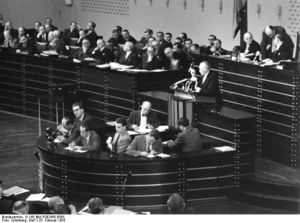 المستشار الألماني كونراد أدناور يلقي خطاباً في البوندستاگ الألماني، في 25 فبراير 1955، حول اتفاقيات بون-پاريس.
