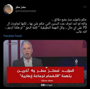 - ^ "بتهمة قيادة جماعة إرهابية بالقاهرة.. الحكم على معتز مطر و4 آخرين بالمؤبد". 2023-04-30.