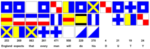 إشارة نلسون الشهيرة، "إنگلترة تتوقع من كل شخص أن يؤدي واجبه"، مرفرفة من سفينة القيادة ڤيكتوري في الذكرى المئية الثانية لمعركة الطرف الأغر.