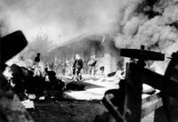 On 17 March a 16-vehicle convoy reached the city without incident.[17] But the following week a two-mile-long, 80-vehicle convoy came under attack, and five passengers were killed.[18] Dov Yosef refers to a convoy being "wiped out", 27 March, but gives no details.[9] Two days later a 60-vehicle convoy came under attack at Hulda and was forced to turn back with 17 Jews and five Arabs killed.[19] Five captured vehicles were driven to Ramle.[9][20] A food convoy escorted by the Palmach reached the city on 6 April without casualties despite being ambushed at Dir Muhsein by a force of "150 Arabs ... joined by 80 Arabs from Abu Shushe." It also survived a second road block at Kolonia, "whose militiamen had repeatedly attacked",[21] taking six hours to reach its destination.[22][23]